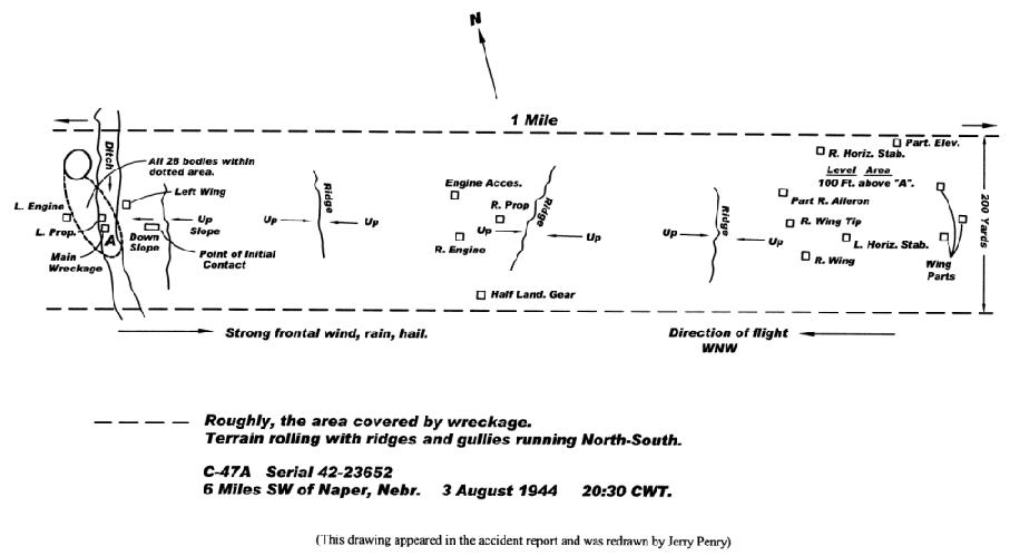 August 3, 1944The crash at Naper, Nebraska, is believed to be the worst accident during WWII in terms of loss of life (28 airmen) from one single aircraft in the United States. A flight crew of four (4) in a C-47A (42-23652) were transporting twenty-four (24) rated P-47 pilots from the Bruning Army Air Field to the Pierre (South Dakota) Army Air Field for advanced training. Near the small town of Naper the plane encountered a thunderstorm and apparently flew into it or tried to get above it. Witnesses on the ground said that a simultaneous flash of lightning coincided with them hearing the motors of the plane stop at approximately 8:30 p.m. The plane was then seen coming down out of the clouds and out of control. The plane crashed in a ravine in a pasture instantly killing all 28 aboard. Investigation into the accident determined that wreckage had been scattered across an area two hundred yards wide by one mile long leading up to the actual site of the impact. The exact cause of the crash was never fully determined and several possibilities existed as to why the C-47 crashed.
