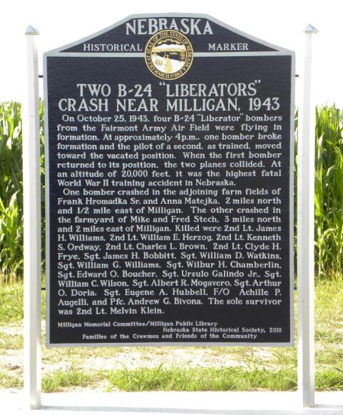 Milligan B-24 Memorial Sign MILLIGAN This memorial is located one mile north of Millgan, Nebraska along Highway 41 for the memory of those killed and the survivor of the mid air collision north of Milligan. © NebraskaAirCrash.com
