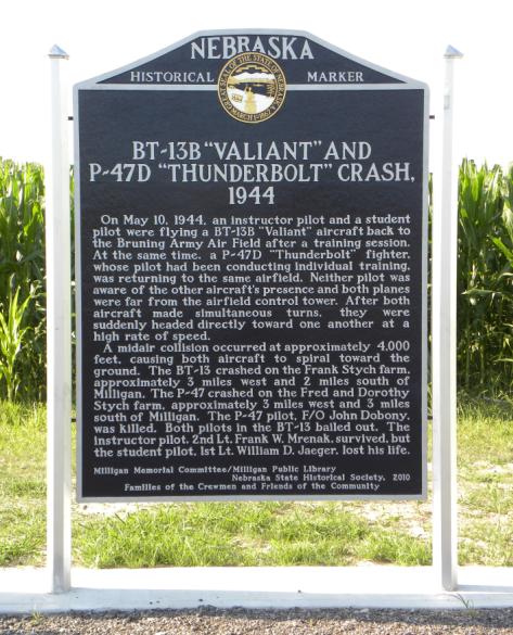 Ohiowa BT-13 & P-47 Memorial Sign OHIOWA This memorial is located one mile north of Millgan, Nebraska along Highway 41 for the memory of those killed and the survivors of the mid air collision three miles northeast of Ohiowa. © NebraskaAirCrash.com