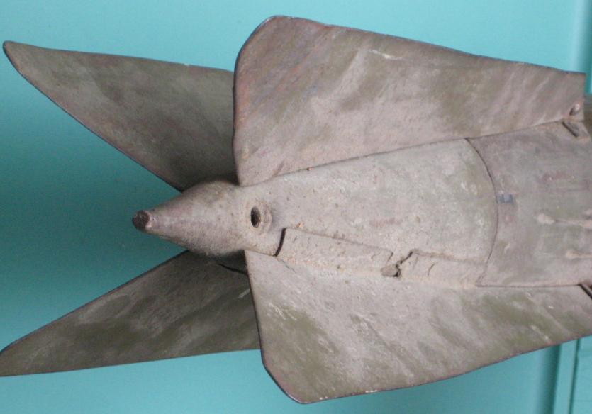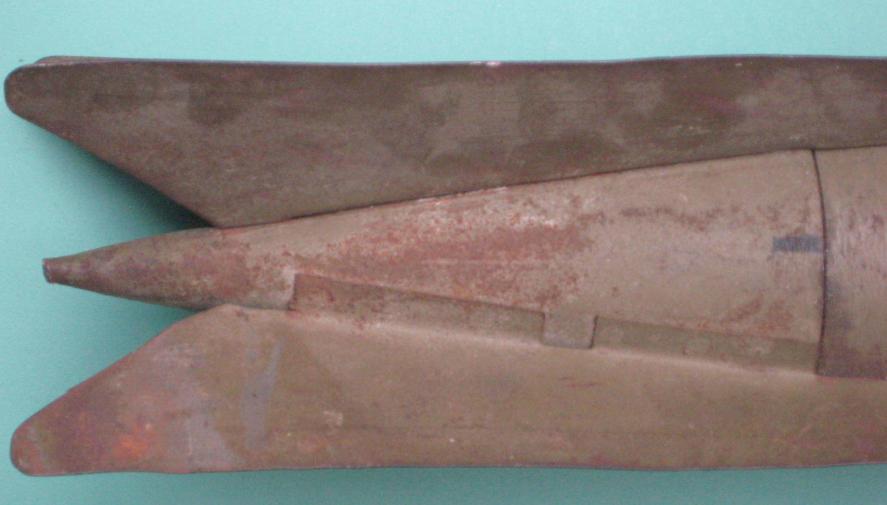 Only the main body below the fins is solid. The fins are made of flat metal and are affixed to the main body instead of being part of the body. In the four examples I have personally seen, all four had the fins painted red/white/blue in the same sequence.